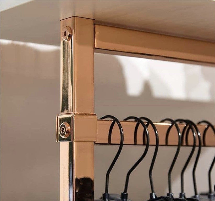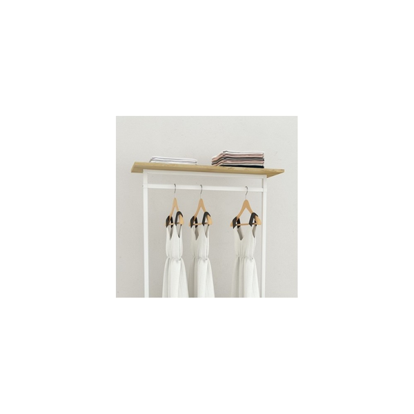 Kledingrek met houten voetplaat (70x55cm) en bijpassende plank met metalen frame aan bovenzijde (70x28cm), metaal finish in matwit, matzwart of blank gelakt.